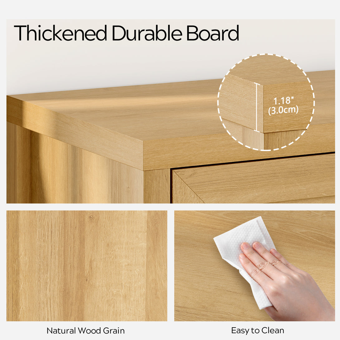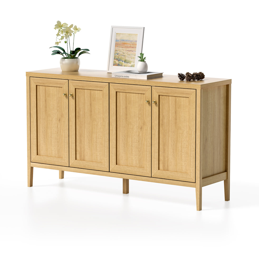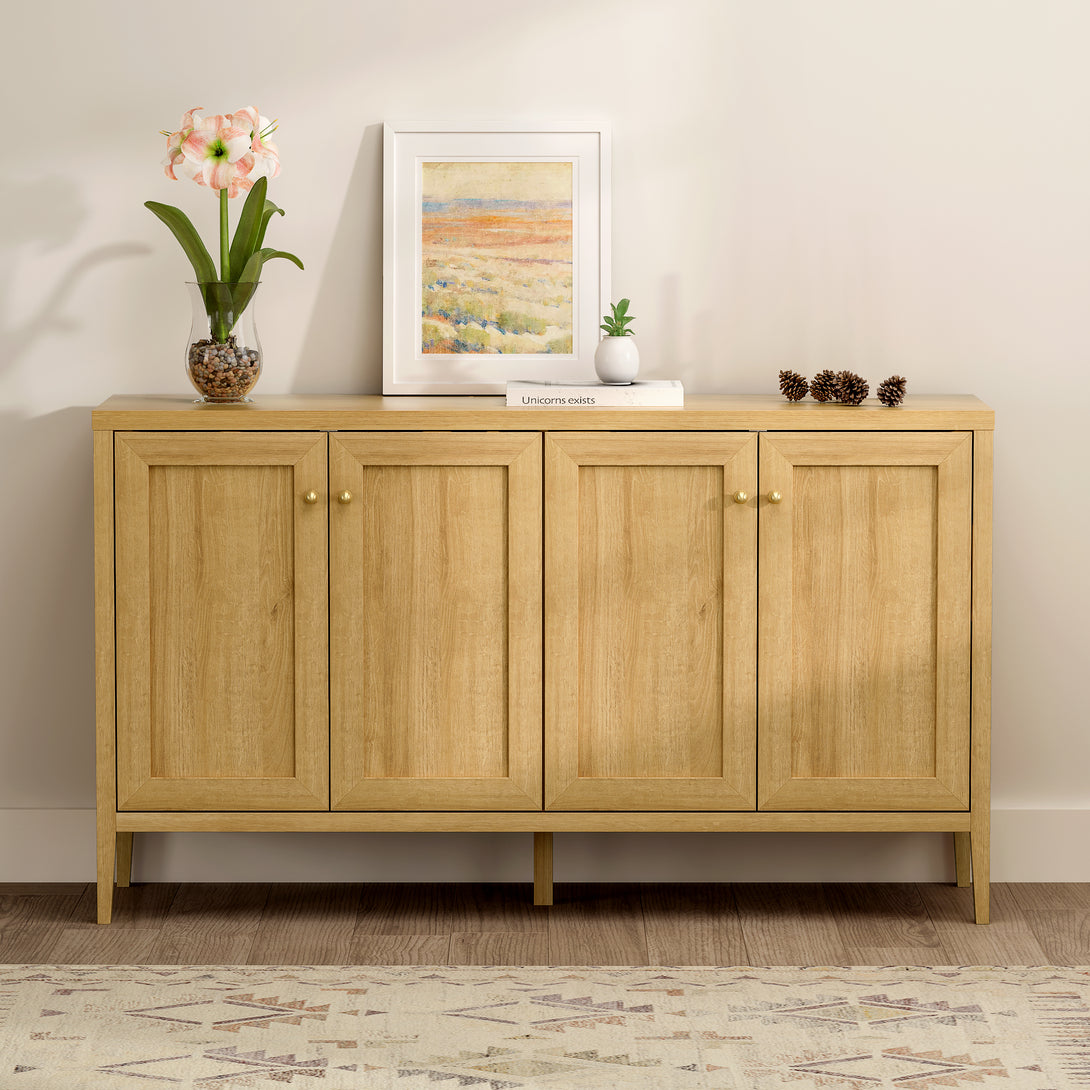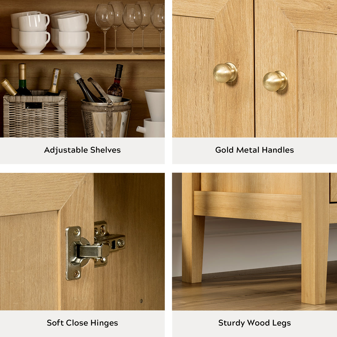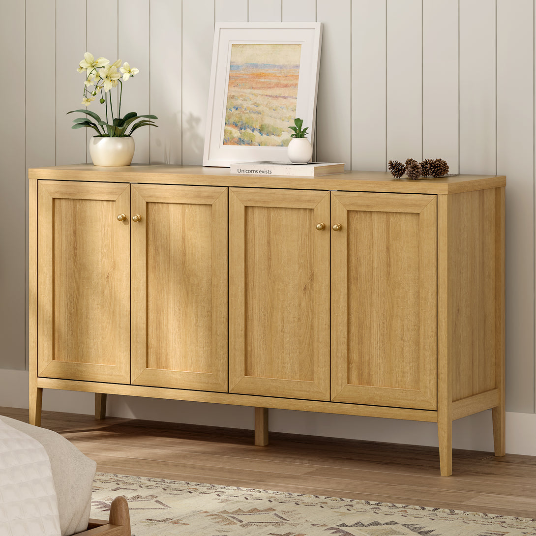 - RUSTIC FARMHOUSE STYLE: Our 4-door storage cabinet exudes a charming blend of rustic country allure and modern elegance, featuring a natural oak finish, gold handles, and an engineered wood construction with a 1.18-inch thick frame for sturdy support